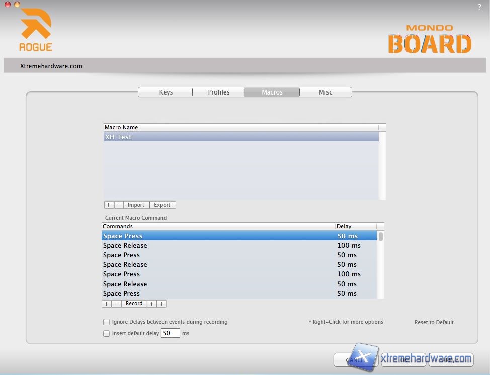 Installato il software sul nostro Mac ed avviato ci troviamo di fronte ad una grafica pulita ed essenziale che richiama il design della tastiera stessa. Il software si compone di quattro Menù che ora andremo ad analizzare. Partendo dal primo, chiamato “Keys”, troviamo un’immagine della tastiera e sotto le funzioni che possiamo assegnare ad ogni tasto. Per fare ciò, ci basterà cliccare un tasto qualunque ed attendere che inizi a lampeggiare di verde. Fatto ciò, cliccando sulle icone presenti sotto la voce Assign Function, potremo assegnare a quel dato tasto una Macro oppure un profilo da caricare o ancora l’esecuzione di un programma. Per la prova abbiamo utilizzato la funzione Macro che ci apre un ulteriore menù dove possiamo caricare la Macro precedentemente creata; in questo caso l’abbiamo chiamata XH Test. Tale funzionalità di creare Macro e gestione delle stesse è possibile ovviamente solo tramite il software in dotazione che ricordiamo al momento essere compatibile soltanto con sistemi Mac, seppur la tastiera funzioni anche su Windows. Per ovvi motivi è facile capire che avremo, installando la tastiera su Windows, solo una parte delle molte funzioni della tastiera come cambiare illuminazione e intensità, tramite la classica pressione del tasto FN+F1/F2, precludendoci la possibilità di utilizzare i tasti “G” programmabili.